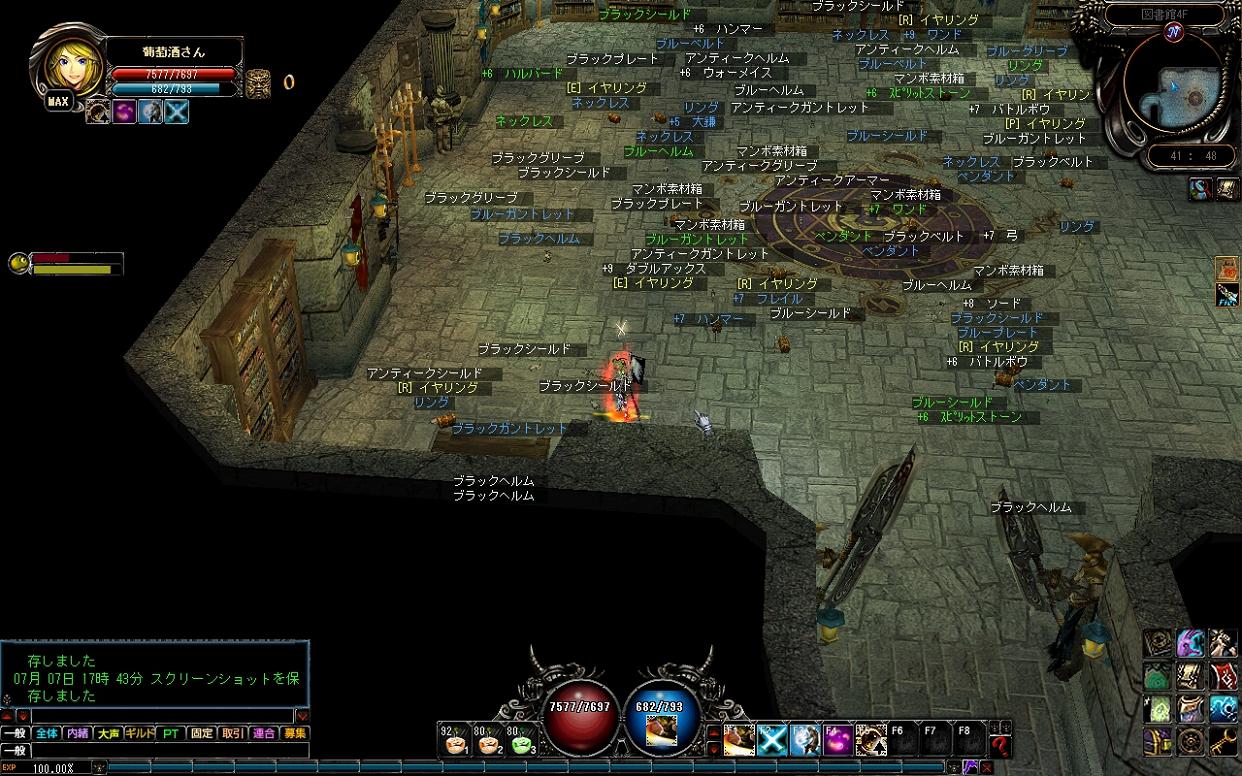 図書館4Fでバゥル発見!しかし・・・その時カウント0!!!最近図書館のカウント0から次階へ移動時間が短縮されてるしw一瞬頭の中で、拾う? F12でSS?どっち?・・・結局 ↓ ↓ ↓ 結局先に拾っちゃいました^^;エク1鯖 図書館4F 雑魚不明 バゥル今回はアイテム欄だけでした^^;今回のマンボイヤリングイベントで3本目イヤリング作りも飽きたぁ~~^^;でも図書館だけは日課をクリアしてますがねwやはり図書館では、タイミングと感、運と継続が成長ドロップ繋がってると実感しましたw