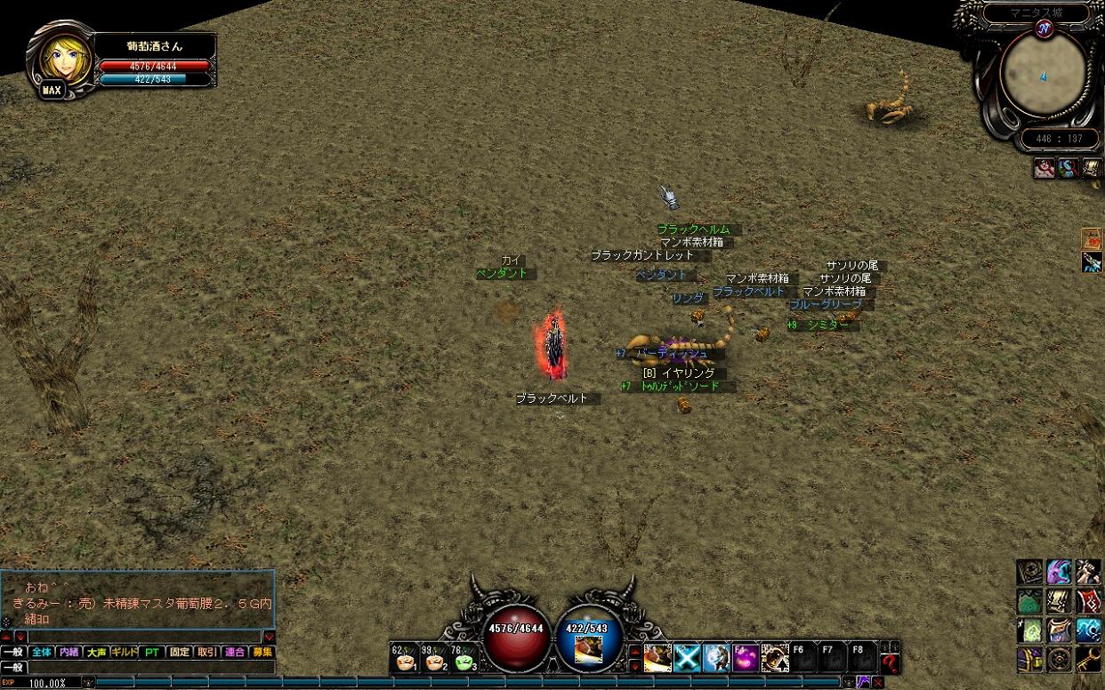 昨日に続いて成長ドロップしました。今回は初となる、高位成長「カイ」でしたw今まで散々高位成長を探して図書館は13Fまで又はマニタスまで狩りに出かけてましたが、中々出ませんでしたがw・・・。マンボイヤリングも何とか+10を1個作る事が出来ましたし、@は軽く流しながら作っています。そんな中「A」を探しに神殿2Fへ行って見ましたが、「O」が多くて中々集まりませんので、前に聞いていたマニタスに行って見ました。フリポ登録が無い為、いつもは避けてたんですが今回は・・・。マニタスは「A」&「B」がよく出ますね。もちろん合円、村正もwサソリ区間を一通り1周して2周目狩りはじめて直ぐの事でした。意外と呆気無くサソリからポロッと^^ ↓ ↓ ↓エク1鯖 マニタス 雑魚サソリ カイ 時間&座標SS参照アイレム欄いつも行かない狩場にも、行って見るものですねw