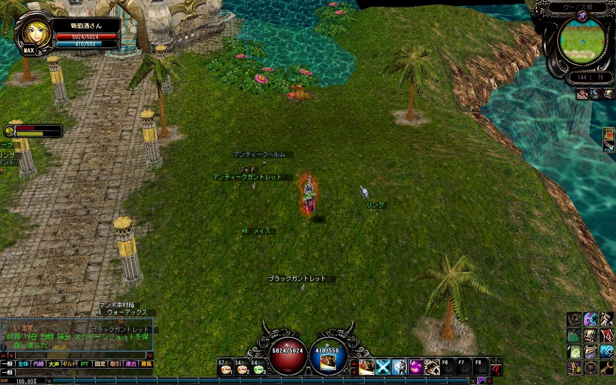 ご無沙汰してます・・・^^最近はエクワールドでバル(グレイビー Lv108)に続き支援パラ(葡萄酒さんLv116)育成中です。つまりどう言う事かと言うと図書館その他狩場での成長探しが出来て無いという事です^^;支援パラは毎日アビス通いでクロが溜まりません、そこで以前の補正ハンマーを貰えるイベントでKクラの買い置きを小出しにPS売りしてます、それとドロップアイテムで高く売れるアンケロ、マナストーンの破片など探しに行ってます、図書館もたまに行ってますが飽きたのか何回も往復する事がおっくうに感じて中々続きません、もっとも今支援パラのLv上げをメインにしてますから、それ以外の狩りは中々出来てないのが実情ですね、そんなこんなで3ヶ月が過ぎてたんですねw。今日はエクでのアビス支援が中々無くて、たまには図書館でもと思いアリ鯖1、2を1回づつ登ってみましたがやはりドロップが良くなくて・・・^^;ラピ1鯖に戻りウーノス島で以前カーラ拾った辺りで狩って見ましたw突然「ガシャ」と言う武器が落ちる時の音と共に金色の文字が・・・そうです3ヶ月ぶりの成長ドロップが来ましたwラピ1鯖 ウーノス島 ヒドゥンビレッジ入り口付近時間と座標はSS参照してねタムファーでしたw雑魚はスピナーでしたアイテム欄もこんな感じウーノス島のこの付近では、魚からアンケロ、マナストーンの破片も拾ってます以前はやはり魚からカーラも拾ってますし、時々狩って見るのもいいかも^^