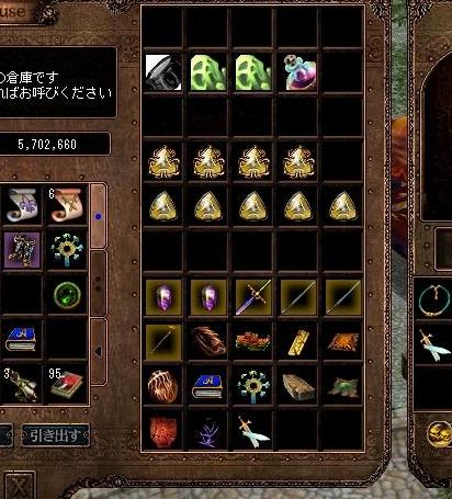 カンストで放置してた葡萄酒2(ラピ)をついに転生しましたwイベ(マンボイヤリング)狩り優先で、一週間来たんですがそろそろ飽きた~・・・^^;昨日は狩り中止で、転生の用意をしてました。低Lv用防具&アクセ・武器を移動してから、アリ鯖へ・・・はじ街 ~ 神殿 ~ タラ ~ チャクラ ~ 塔41~Lv45・99%で寸止めw 課金お試しスクを使う予定ですので。まぁ、またイベ狩り飽きたらLv上げ再開しますw昨夜は狩り小休止、テレビ・ニコ動・YouTubewoを見てマッタリ過ごしましたw早朝よりイベ狩り再開しましたよさぁ~~てここからいつもの始まりか・・・?アリ2鯖図書館へ先客(転マジさん)が居たのでエクへ戻り何気なしに2鯖図書館へ1回目2F~7Fで戻り、倉庫へアイテム移動2回目がこれです ↓ ↓ ↓エク 2鯖 図書館 6F レイ 雑魚不明ゴミが多くて見づらいですねw^^;久しぶりの「レイ」でしたw「カーラ」を拾ってから5日目アイテム欄前回、今回とイベント期間中にも関わらず、結構出ますね。相変わらずアィウだけは拾ってませんがw^^;