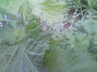 何日か前の内容です。先週・今週幽霊についてまな板にのせてますが、虫食い状態なので、正確ではないですが、面白かったので、頭に残っていること書きたいと思います。 人間の魂の重さを、何年か前外国の方らしいですが、実験されたらしいです。息を引き取る際、確か21g(25g?)だったと思いますが、体重が減ったらしいです。そこで、人間の魂の重さは、21gだと、発表!(不謹慎かもしれませんが、大体普通郵便¥80以内の重さです。)犬は、体重に変化が無かったので、魂は無いと発表!その次の年ぐらいに、別の方が、「人は死ぬ瞬間体温が上がり、発汗する。その汗の重さだ。」「犬は、毛穴が無いから、汗をかかない。よって、体重は減らない。」と発表したそうです。個人的に、魂に重さがあって欲しいと思います。また、100人に頭に電磁波の流れる帽子をかぶせ、電磁波を流し感想を聞いたところ、80人(?)が「見えないも物が見えた。」(幻覚)「音が聞こえた。」(幻聴)を体験したと答えたらしいのですが、次に同じように説明し今度は、流しますよ!と言いながら電磁波を流さなかったらしいですが、やはり80人が幻覚・幻聴を体験したと答えたらしいです。思い込みなのでしょうか?私は何年か前、幽霊に踏まれたことがあり、確かに重さを感じたのですが・・・これからも、通勤途中に聞く「三枚おろし」楽しみにしてま~~す画像が悪いですが、白黒のしましま模様のバッタが青しそに止まっていました。「お前か?しそ穴ボコだらけにしたの・・・」(>_<)