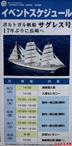 8月7日、海フェスタ長崎にまた行ってきました~!今回のお目当ては 8月3日、長崎港にポルトガル帆船「サグレス号」が17年ぶりに来航したのだ。 サグレス号はポルトガルの海軍の練習船で、過去、長崎には昭和53年、58年、 平成5年に続き4度目の寄航。今回の寄航はなんと17年ぶりとなります。 これは見に行きゃなきゃね! 船のデータは 総トン数 1.940トン、全長 70.4メートル、全幅12メートル、速さ最大9ノット 帆を活かすと最大16.5ノットの速さを誇ります。 日程より、今回は船内の観覧が自由にできましたので、写真撮りまくりです! さて、内部の様子も興味深いものですが、なんといっても外観が素晴らしい! 船首、船尾、メインマストなんて言いようがないです! 最後に、今夜はサグレス号の長崎での最後の晩です。夜のライトアップの様子も 美しいもんでしたよ。光が海面に反射していい雰囲気! 明日は出航セレモニーがあり、その後、午前10:00に韓国に向けて出航です。 次回は、出航セレモニーと出航の模様をアップします。
