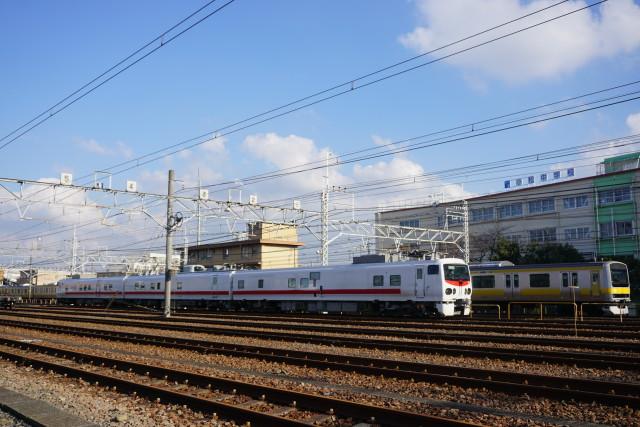 今回は マヤ50 5001付きなので 是非とも自力走行の 俯瞰場所を押さえる事に(11月13日撮影)折り返しは 残念ながら ここで撮影すると釜 牽引の入れ換えが撮れないので 異動ひさしぶりのEF81 95が先に 単機回送で到着後に 越中島から キヤE193系East i-D+マヤ50 5001が 自力走行で到着EF81 95が自動連結器に連結その後はインターバルが有るのでマヤ50 5001等 じっくりと 決め細かにの 撮影でした次回の 釜が気になる 今日この頃です。