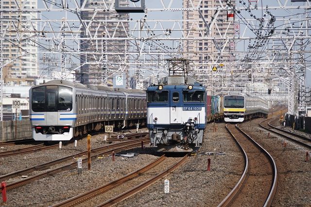 続いて 先にEF65 2127JRF広島カラシ扉色 牽引タキが通過してEH500-1牽引トキ 安中貨物が到着の ネタ釜揃いそして EF64 1023国鉄色 大宮出場が発車して直ぐに 被りの電車が到着その間の 異動中に 被り電車が発車して行くとなんと 国鉄色出場発車に続いて 青森 配給が到着してました(笑そのまま直ぐ撮影 消える6扉車も撮り後追いには 中央線のE233系と大宮で再会して去りました(トップ画面に)総武線からは 209系だけで無くE231系も撤退とは現在も 901と1号が 存在して良く乗りますが編成撮りは 番号が確認出来ず 目の前で分かり撮り逃がす結果で 乗って気が付く今日 この頃です。(^_^)v^^。