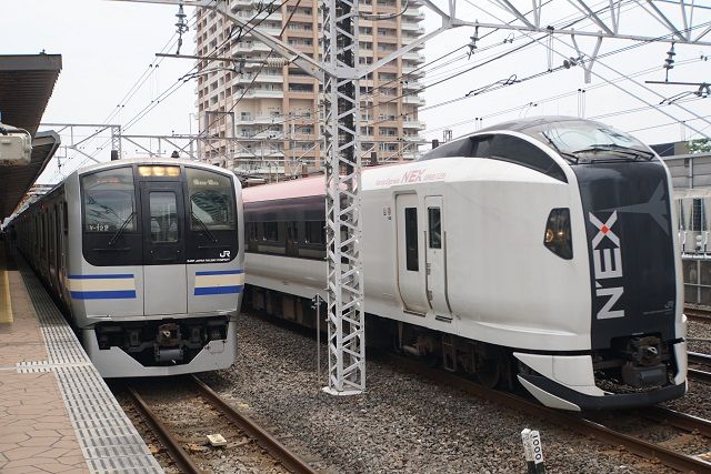 東急 甲種の追いかけ乗り換え合間の川崎駅時間を見計らって185系 特急「踊り子」号をその合間も 南武線 京浜東北線 同じE233系の並びそして八王子駅では E353系 特急「あずさ」と211系の並び高尾駅に移動して 211系の並びを狙うも左側の車両は 動かず...帰りの電車が先に発車で帰りました途中 お茶の水駅乗り換えは通勤ラッシュの為厳しいので 三鷹駅で普通に乗り換えその時 反対側には 中央線130周年ラッピングが左側の車両到着の被り寸前でした(7月9日撮影)そして 普通の始発で帰りましたまたの機会も 有効に活用する今日 この頃です。(^_^)v^^。
