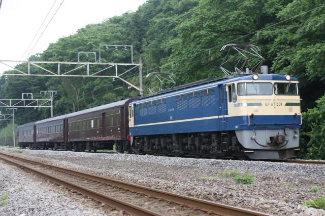 上越線 沿線で なんとか 晴れまが 出た ところで 水上行きの EF65 501+旧客3を、