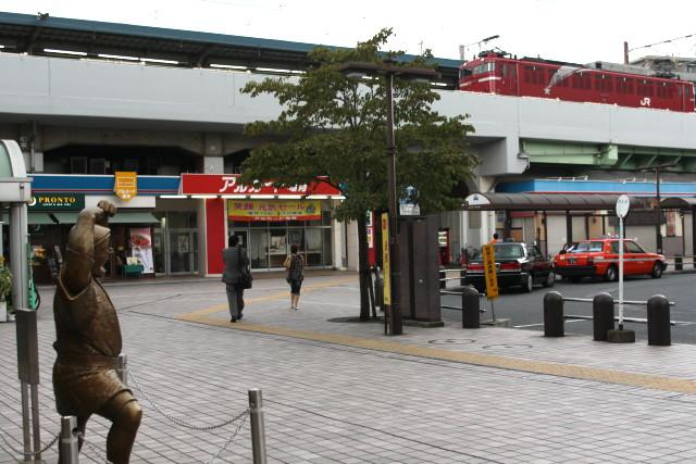 安中貨物狙いに左側の亀有交番派出所と銅像を