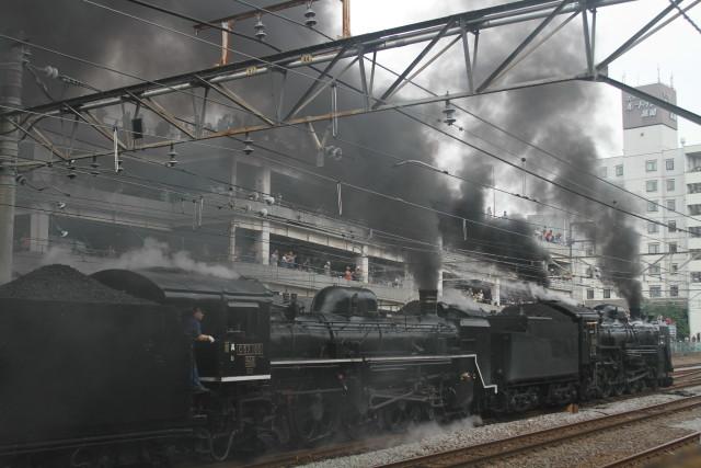 重連と 後ろに D51の煙が 見え、3本の煙が 確認出来ます