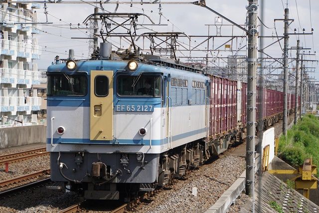 その間にカラシ扉色のEF65 2127牽引コキが