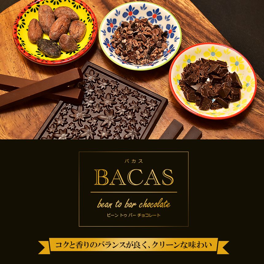 ビーントゥバーチョコレート始めました。 その名はバカスビーントゥバーチョコレートです。 BACAS bean to bar chocolate は、コーヒーで培った焙煎技術を余すところ無く発揮してカカオの旨みを引き出した、豆からこだわったチョコレートです。 是非ご賞味ください。BACAS bean to bar chocolate「ビーントゥバー」は、2000年代初頭にアメリカで誕生。アメリカでは時代とともにチョコレートが香料や植物性油脂などを加えた「甘いお菓子」となり、カカオ豆本来の風味を失っていきました。そのアンチテーゼでもあり、チョコレートの原料であるカカオ豆への素材回帰ともいわれるのがビーントゥバー。元々チョコレート文化は、ヨーロッパから。その後、大量生産の甘いお菓子となり、今回のビーントゥバーをサードウェーブ(第3の波)と呼ぶ人もいます。どこかで聞いたことのある呼び名です。そう!コーヒー業界でもサードウェーブ(第3の波)がありました! 1970年頃までの大量生産・大量消費の時代、経済効率のよい浅煎りが好まれたのがファーストウェーブ(第1の波)。1971年にスターバックスが誕生し、その後シアトル系コーヒーチェーンが世界を席巻したのがセカンドウェーブ(第2の波)。そしてサードウェーブ(第3の波)が、豆の産地や農園を重視し、豆に合わせた焙煎をするなど、豆の個性を大切にした高品質なスペシャリティコーヒーを追求するのが特徴で、「豆からカップまで」という標語が掲げられており、流通経路の透明性も大きなポイントとされています。実は、コーヒーのサードウェーブ(第3の波)も、チョコレートのサードウェーブ(第3の波)も、同じ傾向があるのです。それは、アメリカから始まっており、豆の個性を活かすこと、そしてその際にコーヒーとチョコ(カカオ)共に焙煎と言う工程があるのですが、両方とも浅煎りにして、酸味を強調すると言うことです。浅煎りの場合、素材の成分が分解されにくいので、個性が残りやすいのですが、個性を引き出すことに意識が向きすぎて、本来の深い味わいが、疎かにされているような気がするのです。いわゆるコーヒー感・チョコレート感というか、王道的要素を忘れて、尖がりを強調する傾向があります。これは、消費者が置いてきぼりにされている気がするのです。コーヒーやチョコは、貴族やお金持ちの社交の道具ではなく、一般庶民が気軽に食し、癒されたりする、もっと身近なものであって欲しいと言うのが当店の想いです。そこで、当店では、より多くの方が楽しめるよう「雑味のないクリアな味わい」「チョコレートらしい深いコクと滑らかな舌触り」、そしてビーントゥバーらしい「素材の個性を活かした柔らかな酸味と香り」を目指し、ビーントゥバーチョコレートを始めることにしました。コーヒーで培った技術を、チョコレートに存分注ぎ込んだ、渾身のビーントゥバーチョコレートを是非お楽しみください。BACAS bean to bar chocolate バカス ビーン トゥ バー チョコレート