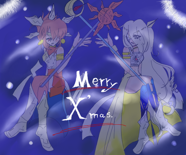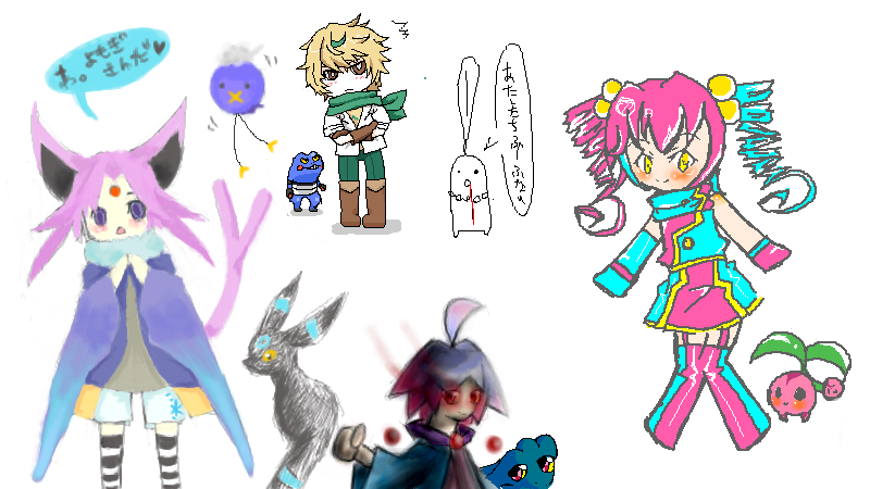 はいなんか始めたばかりなのに全然日記を書いてなかった雀です。今日はクリスマスカード用に書いた絵をもってきました。ポケの擬人化です。おまけに加工前↓