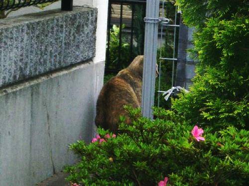 今朝、起きたら勝手口から「じゃりじゃり」っと音が。小窓から覗くとネコがいました。犯ネコです。夜中の音もこのネコだと思われます。やっぱりウチをトイレにしていてました・・・。逃げるところ