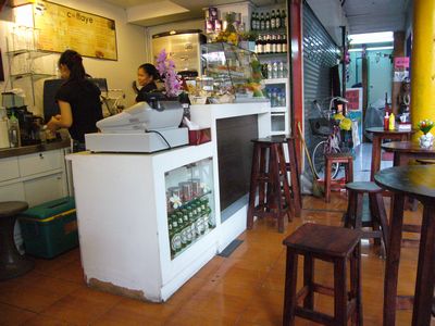 来月、再びタイ・バンコクへ行くことになりました。写真は、2月に行ったときの"いきつけのCAFE"です。プラトゥーナムのマーケットにあるCAFEで、3日間の滞在で、10回近くは行ったんじゃないかな。コーヒーが飲みたいというより、煙草を吸うためにです。バンコクも喫煙者には不自由なところになったもんだ。