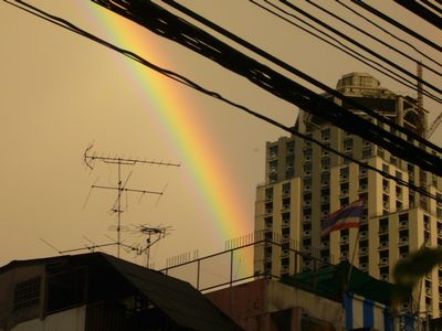 とうとう私の住む近畿地方も梅雨に入ってしまいました。長髪には辛い季節です。しかも、癖毛なので髪の毛が爆発してしまいます。これはこれでロックな感じでいいんだけど・・・さて、雨期に入ったバンコクでものすごいスコールにあってしまいました。その後に綺麗な虹ができたので撮影してみました。We Must Be Over The Rainbow~