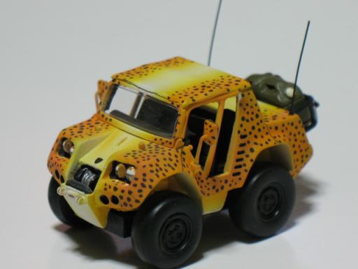 今日は(昨夜から…)私の好きな作業であるレーシング・フルデカール製作の為、イラレと格闘してました 何が出来るのかは、後のお楽しみって事で 本日のギャラリー(セーブしていかないとネタ切れしそう)KamQさんのランボルギーニ・チータです 私のある意味、得意技であるアニマルシリーズですね(笑) あの武骨な車体を、見事コミカルに変身させているあたりは、さすがです 全体的にトーンを落とす為、最初にサンドイエローを吹いて茶系にもっていきます。それから白を車体中心から立ち上げて柔らかい白にします。サイドはイエロー、オレンジとグラデーションを程良くかけて、最後に筆で斑点を根気よく乗せて(これが一番大変だった)フラットクリアーで完成~ ジュリ缶やスコップなどの装備品は脱着可能(スゴイ!) たまには、こんな息抜きも楽しいですよ