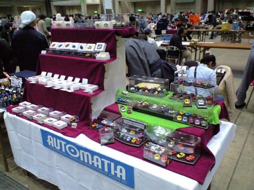 5月5日、ビッグサイトで行われたイベントに、のらさんが主宰する『AUTOMATIA』のスタッフゥ~♪として参加してきました(=^▽^=)まずは販売ブースの設営です。もうこの手の作業は手慣れたもんで、サクサクっとこれだけの商品と見本を並べて終えて準備完了~(b^-゜)ブース全景は、こんな感じ(これでも全商品を並べきれていません…) AM11:00 OPEN!待ちわびたお客さんが、一気になだれ込んできます( ̄○ ̄;)大半がフィギュア目当てのお客さんですが…有り難い事に、朝イチから当ブースにて大量お買い上げのお客さんも数名いらっしゃいました(*^o^*)ありがとうございましたm(_ _)m 前回から、自作チョロQのお仲間にキット提供のお願いをし、商品展開が格段に増えたおかげで今までに無い売り上げになりました(^-^)/ 今回で、このイベントはラストです(;_;) 参加回数を重ねて、ようやく商品の認知度が上がってきたところなのに、とても残念です…。仲良くなったディーラーさんも居たのに(T_T)でも、またいつか同じ場所で会える事を信じています(^-^)ノ~~