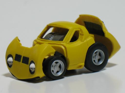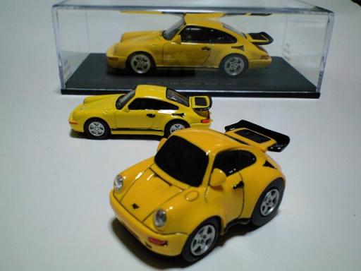 さて、前回の“RUF”ネタに続きチョロQ版のCTR イエローバードの紹介です('-^*)/ 原型制作はKamQさん、フィニッシュはもちろん私です。(奥から、スパークモデルの1/43レジン製完成品。中はオマケくん。)この車に関しては、多くの説明は必要ありませんね(*^-^)b 80年代後半、ヨーロッパの有力自動車誌が公式に行った最高速度トライアルにおいて、見事市販車No.1になり、一躍世界中にRUFの名を知らしめた車両です(マクラーレンF1が登場して、あっさり破られましたが…) 圧倒的な動力性能もさることながら、ベース車種(ポルシェ社からホワイトボディの供給)やカラーリング(車種ごとに開発車両のイメージカラーが存在する)からくるカリスマ性に拍手です♪(*'-^)-☆カラーと言えば、このチョロCTRをもん太さんに見せたら、開口一番『ピカチュウ!』と言われてしまいました(笑)サトシ:『ピカチュウ~!10万ボルト~ォ!!』(走召~爆)