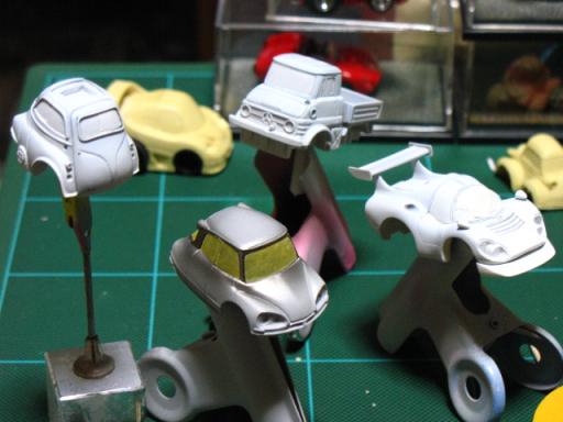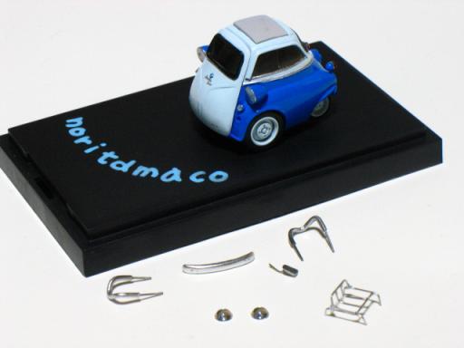 ブログ更新…ちょいとサボリ気味でしたね記事はサボっても作業は、そこそこやってますあくまで、そこそこです(笑) イセッタ乗りの“たまこさん”仕様を制作してました繊細なブルー系のツートンは、師匠・のらさんの特注ブレンドカラーを使用しました(苦労したと言うだけあって、とっても発色がイイです)現在、小物パーツの最終仮組でクリアー後、組み立てれば完成です(飾り台には、ちゃっかり自分用に本人直筆サインを貰ってあります) のらさんフィニッシュと同様に、ミラーとキャリアを追加予定。ついでだから、ワイパーも着けてみようと思いますところでブログの写真って、拡大して掲載してるので実寸が把握しずらくないですか 自作チョロQをあまり、ご存知ない方の為に定番のタバコを置いてみました(なんで大きさの比較をする時って、必ずタバコなんでしょうか…セブンスターなら、完璧ヤンキーっすね)いかに小さいか、お分かり頂けましたでしょうか