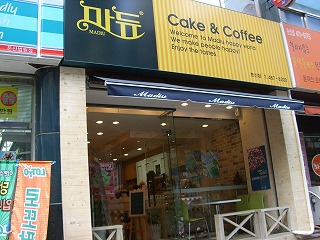西区屯山洞という所は、大田の江南と言われているところです。特に法院前というところは、人気の塾がたくさんあり、当然のことながらこの周辺のアパートは高いのですが、子供の教育のためなら移民もいとわないという、韓国のお母様方に人気のアパートもこの周辺にあります。今の大統領が、大田のある忠清道に首都を移すという約束の下当選したので、その頃この周辺のアパートはほとんど倍の値段に値上がりし、この頃はソウル並みになってしまいました。当然この周辺のお店もオサレな感じで、舌の肥えたお客を満足させられない店は次々とつぶれていくという感じです。お客としては嬉しい限りですが・・・。その中にあって、この頃この周辺にお住まいのマダム達に人気だというカフェに行って来ましたので、ご報告します。渡○教授様と一緒だったのですが、教授様も気に入ってくださり、その時はサンドイッチを一緒に召し上がったのですが、美味しいとおっしゃっていました。場所は、地下鉄市庁駅を降り、クローバーアパート方面という方のエスカレーターを上がり、そのまま歩いて、現代アイテル(ヒョンデーアイテル)というオフィステルとSK給油所の間の道を左に入って70メートルほど入った左側です。外観です。コーヒーも2000~3000ウォンと良心的な値段で、サンドイッチもソウルだったら3000ウォン以上のものが2000ウォン前後で食べれます。 何といっても、ケーキのばら売りがあり、日本人には嬉しいのではないでしょうか?もちろん、ホールでも売ってます。小さいお店ですが、韓国に居ることを忘れさせてくれるホッとできるお店です。「マデゥー」TEL042-487-8203 (9時~24時)