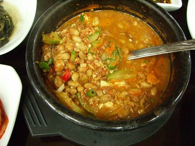 韓国式なっとう汁です。私は大の納豆好きです。そのため、ココでは納豆を作っているほどです。その私が昔韓国の田舎を旅行中に、食堂でテンジャンチゲ(味噌チゲ)を頼んだら出てきたのがチョンクッチャンでした。その時から大のチョンクッチャンファンで食堂の入り口にこの文字があると思わず入ってしまいます。そんなわけで、今日はそのうちのオススメのお店を紹介します。このお店は、結構ご主人が凝り性のようで、どこかの大学教授と研究に研究を重ねたオススメのチョンクッチャンという事です。納豆が体に良いという事で、納豆の錠剤もあるほどですが、もともと納豆といっても日本のようにネバネバしてるものではなく、日本のよりちょっと納豆臭い韓国の味噌を、もっと発酵させて臭くしたのが韓国の納豆味噌チョンクッチャンです。特にこのお店は、ランチに行くとおかずも数多く、お肉もメニューにあるのですが、お腹がいっぱいになってしまい、食べた事はありません。ランチがオススメです。まめまめしいでしょ?コクがあって、納豆好き、まめ好きにはたまりません!お値段は5000ウォンです。KBSのある万年洞の、トンバンサク・レポスというチムチルバンの向かいです。昔はファンチョン・チョンクッチャンというお店だったのに、いつの間にかファンチョン・トッkッサmサmギョpサrという店に変わってました。でも同じご主人で、チョンクッチャンもやってます。チョンクッチャンのお店は、儒城にもあるのですが、それはまた他の機会に・・・。