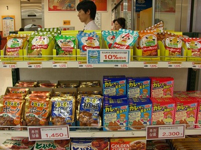昨晩買い物兼夜のウォーキングでもしようと玄関を出ると、ちょうどEマートの広告がドアノブにぶる下がっていたので玄関先で確認しました。そしたら「日本代表ブランドフェスティバル」とうたって、S&B食品をやってるらしい事が判明。今日の買い物は迷わずEマートだわ!という感じで歩き出しました。ところが、どこを見てもフェスティバル!という感じのコーナーはなく、端っこの方に少しだけ「どこがフェスティバルやねん!!!?」という感じで、商品が置いてあったので、写真撮ってみました・・・。大田はまだまだだわ・・・と実感しました。まあ、カレーは良いとして・・・29000ウォンのブルーマウンテン、誰が買うんでしょう?見栄っ張りな韓国人?違いの分からない日本人?日本の食品って「何で数ある中から、これ?」という物が多すぎますよね。飴なんて「カスガイ」のものばっか・・・。カスガイって・・・知ってますけど、100円ショップで売ってても買わないって!誰がこういうの企画して輸入するんだろう。不思議です。