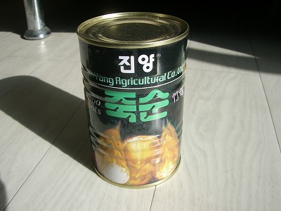 私も昔、ここでたけのこって見ないけど、どこで売ってるのかしら?ところで、たけのこって韓国語でなんて言うのかしら・・・と辞書を引いて買いに行きましたっけ。先日、ある日本の方に質問されて思い出しました。^^)韓国のたけのこは缶入りなんです。春に市場に行くと生のたけのこも皮のまま売ってるそうですが・・・。春まで待てない方は、どうぞ!