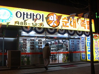 市場なんかいくと、ヘビのようにとぐろを巻いてるヤツです。でもそれは、えせスンデ。中にチャプチェしか入っていません。本物のスンデは、野菜や香辛料が入ってちょっとクセのある濃厚な味です。88年に新村に住んでいた時に、いつも通る新村市場にスンデコrモkがあり、私が始めて本物スンデを食べたのは、そこででした。店の前に、えせスンデより太いとぐろがあり、スッゴクお客さんが入っている気になるお店だったのですが、なんせ入ってるのは男ばかり。あと一週間で日本に帰国。という時に、勇気を出して入りました。皆さんがいっせにこちらを見たことを、今でも思い出します。ふふ。でも、これが私の好みにピッタリの物で、最期の一週間何で今まで入らなかったのか後悔しながら、足げく通ったのでした。その後91年に、高麗大学の語学堂に通った時に、下宿してた家の近くに、「アバイスンデ」という有名なスンデの専門店がありました。担任の先生のご主人が、私がスンデが好きだといったら、よく連れて行ってくれたお店です。最近、同じ名前のお店が近所に出来たことを発見。夫と行って見ました。大田で食べたスンデでは、一番クセが無くて美味しいお店です。スンデ好きですから、結構あちこちのスンデ屋さんに入ったのですが、どこもクセがあってイマイチ。ココだ!!と思える店がありませんでした。・・・なので、とうとう見つけた!という気分です。願わくば、変わらない味とサービスを!!という感じ。初日に行ったときは、夜遅かったのでご飯類は頼まず、スンデ盛り合わせ小とマッコリrだけ。8000ウォンでほろ酔い気分。お腹もいっぱいです。2,3日置いてすぐ、私の好きなスンデクッパpを食べに行きました。スンデと色々な臓物が一緒に入ってます。ココではパpの代わりに、ミョン(麺)が入ってるのもあったので、食べてみました。・・・もう少し、固ゆでだったら良かったのに・・・味はGoodです!3000ウォンとお安い。場所はロデオタウン裏の通りを、建物にを背にして右に行ったところ。サンポーカルククスの前です。24時間営業。042-488-1236その後、この店は韓国らしくだんだん手を抜き出しました。^^