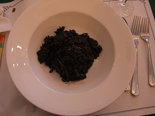 今日は、ハワイアンキルト教室の日。教室を始める前に、みんなでランチ!!っと思ったのですが、今日は皆さん忙しくて、子供一人を入れた4人で教室のすぐ前にある前回のイタリアンレストランに行きました。hanuruさんがリゾットを食べたと言うので、私もリゾットに挑戦。ウクライナ嬢が前回もオススメしたイカ墨です。出てきたお皿を見て、一同お~うっ!!っと歓声。当たり前ですが、真っ黒です。^^今日、特別同じお店を載せたのは、このイカ墨リゾットがあまりにも美味しかったから。お米の硬さといい、コクといい、言う事ありません!!一ヶ月に一回は、イカ墨リゾット食べに通いそうです。^^