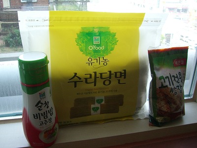 ココに住んでいて日本に帰った友人と、日本で会うことになりました。ココの味が恋しいだろうな~!と思い、お土産を考えました。最初は、先日日本人妻会の集まりの時、西○会長が持って来てくれたレトルトのカムジャタンが美味しかったので、それにしようと思っていたのですが、考えてみたら、彼女は料理が上手なので材料さえ揃えば何でも出来るな・・・と思い、選んだのがこれです。この頃、ゆっくりスーパーにいく暇も無かったけど、このタンミョンは新発売の扱いやすい長さの有機農のものです。チャムジョンウォンというメーカーから味噌や小麦粉も同じシリーズで出ていました。次回使ってみようかと思います。それから、以前食べて美味しかった肉専用サムジャン。この頃は日本でもサンギョpサr用の三枚肉が売ってるとの事ですので、ケンニpも一緒に持って行こうかと思ってます。後一つ、新発売で気になっていたチューブ入りのビビンバp用のコチュジャン。今までこのタイプだと、チョコチュジャンといってお酢の入っているものでしたが、やっと普通のコチュジャンもこのタイプが出て、私も次回はこれにしようと思ってます。以上ですが、他にコチュカルも必要かしら・・・。遠慮せずに言ってね!!
