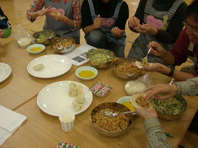 ブログでお知らせした時は反応が鈍く、あまり集まらないかな・・・と心配したマンドゥー教室でしたが、男性の参加者もお二人いらっしゃり、またソウルからこちらに移って来られた方も初めて参加したり、家族で参加した方も多く、なんと日本人だけで大人19名、子供10名集まりました。まずは、大阪に7年住んだという前回も講師をしてくださった方が、マンドゥーの材料と作り方の説明してくださいました。とても緊張したそうですが、そうとは思えないりっぱな日本語でした。今日は、コギマンドゥーとキムチマンドゥーを作りました。コギマンドゥーは、牛と豚のひき肉、それから豆腐、タンミョン、長ネギ、にら、しょうが、卵を入れます。それに、キムチを足せばキムチマンドゥーです。それから、みんなでおしゃべりをしながら勝手な形にマンドゥーを作りました。韓国人も驚くほどマンドゥー作りが上手だったのは、我日本人会会長の西○さん。さすがに、ミョヌリとして鍛えられている腕前です。^^ちなみに、西○さんは韓国のお正月には8人で5,600百個のマンドゥーを作るそうです。すごいですね~~!家族でいらっしゃたお父さんと子供、それから韓国側の男性は地下にある体育館で遊んでいました。出来上がったマンドゥーは、半分は蒸しマンドゥーで食べ、半分はトックマンドゥークk(韓国式お雑煮)にして食べました。上に飾る卵やお肉、のりまで準備してくださり、とても美味しかったです。教会の皆さん、本当にご苦労様でした!!食事をしている間、初めて会った方達が挨拶したり、情報交換をしたりして楽しいひと時を過ごしました。勿論、今までいつも会ってきた方々との交流の場としても嬉しいのですが、初めて韓国に来たり、他の地域から大田に移って来たりして、大田に日本人はいるのかしら・・・、大田はどんなところかしら・・・と不安な思いを抱えている方が、こういった場所にいらっしゃる事で、大田にもこんなに日本人がいるんだ・・・。楽しそうだな・・・。と思え、ココの生活を楽しめるようになったら良いな・・・と思いました。今日は、ある大学に交換教授としていらっしゃてる男性が、お一人で参加されました。その方は教授という立場にあり、年配の方なのに、なぜか自由な感じがあり、人生を楽しんでいらっしゃる感じがして、好感を持ちました。もう一人、男性で一人で参加した方も、やはり短い韓国滞在ですが、韓国人や日本人と積極的に交流して、充実した日々を送っているようです。男性が一人でこういった場に参加するという事は、とても難しいことだと思います。こういった方々が、韓国での生活を少しでも楽しんでいって下さったら良いな・・・と思いましたし、勿論そのためのお手伝いなら、喜んでやらせていただきたいな・・・と思いました。これからも、希望のメニューで定期的に料理教室を開く予定ですので、このブログを参考にして、積極的に参加して下さい!!教えて欲しい料理などありましたら、リクエストお願いします。