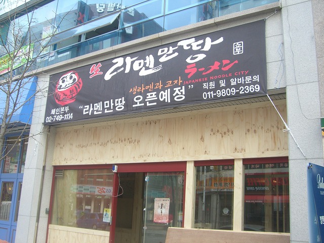 開店しそうです!まだ、開店してませんので焦らずに・・・。^^今日ケーキを買いに、マデゥーに行ったら、その横のお店が工事中。新しいお店が出来るのね・・・と思って、看板を見てビックリ。「ラーメン・マンタン」とハングルで書かれているではありませんか!!さっそくカメラを取り出しました。あまり知らない名前ですが、ホームページがありました。http://ramenmt.com/index01.htm各種ラーメンと餃子、ヒレかつ、牛丼、おにぎり、それに居酒屋メニューもあるようで、期待しちゃいます。いつ開店なんだろ・・・。開店したら、またお知らせしますね!