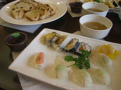 昨日、韓国らしく急に日本人会会長さんから連絡をもらい、職場の大学で実習生が作ったランチをご馳走になってきました。急だったため、残念ながら3名でお邪魔しましたが、教室がすっかりレストランになっていて、ウエイターも実習生。なんだか、レストランごっこをやってる感じで、久々の学園祭気分でした。最初に、手作りのレーズンパンがどっさり出ます。・・・がしかし、なぜ後から来たテーブルにはすぐパンが出るのに、私達のテーブルには催促して、また催促してやっと出てきました。(日本人をワンタしてるんかい??!!^^)なので、パンをほとんど食べないうちに注文したお寿司が出てきました。お客がいっぱいで、メニューに一緒にあるカクテルを注文してもすぐ出てきそうにないので、早めに注文し、パンも追加で注文です。そしたら、なんと中華の前菜の盛り合わせがドーンとサービスで・・・。パン食べるんじゃなかった・・・と言いながら、ホタテやえびの美味しさに箸が止まりません・・・。^^やっと食べ終わるかと思う頃、またまたナマコのたくさん入った海鮮炒めがサービスで・・・。えっ~~~!!と言いながら、食べる食べる・・・。^^きれいな日本人女性3人が、いやーん食べられな~い。なんて言わずにしっかり食べてくれて助かりました。さすがに主婦!!^^日本人の女性もケッコウたべるじゃ~ん!!ってきっと噂してますよ。^^今回行けなかった方残念でした。次回は早めにお知らせお願いします!!会長さん。