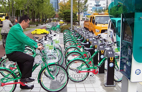サイクリングが気持ちよい季節になりました。あることは知りながら、自分の愛車(自転車^^)があるのでなかなか利用しなかったレンタサイクル。先日、帰りは車かも・・・という状況だったため、家の近くにあるのを思い出し思い切って利用してみました。この、レンタサイクルの良いところは、借りた所に返さなくても他のレンタサイクル場に乗り捨て出来る事です。面倒くさそうな説明は読まずに、電子表示板(キオスクと言うらしい^^)に直接アタックしてみました。まず、「自転車を借りる」ボタンを押し、借りたい自転車の番号を押します。するとバスカードで借りるか、ケータイで借りるか選択する事になります。バスカードはハナ銀行で発行される「ハンクミカード」でなくては駄目です。私のはストラップ式のコンビ二で買った物なので、ケータイで借りるを選択しました。ケータイ番号と、そのケータイ番号登録者の住民番号の後ろの番号を書き込みます。(ほとんどの方はご主人の番号ではないでしょうか?)すぐ、ケータイに認証番号が送られてきますので、その番号を書き込めば終了です。自分の指定した自転車の所に行き、ちょっと前に押して機械から外せば乗れます。返す時も、ただ機械にはめ込めばOKで、簡単です。一時間まで無料なので是非利用してみて下さいね。どこに設置されてるかとか、料金など詳しく知りたい方はhttp://www.ta-shu.com/bike/tasu/jsp/main/main.htmを参照して下さい。私も西区のレンタサイクル地図を印刷して持ち歩こうと思っています。