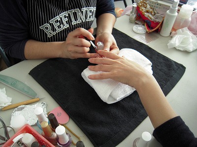 今日は、毎週金曜日にミョヌリカフェで開かれている趣味の手作り会でした。今は、可愛いカバンを作ってます。^^今までは忙しくて度々会えなかったミョヌリの一人がとっても多才なことを知り、今日の教室も彼女が先生です。タイチョーと呼ばれるのにピッタリな頼れる彼女。実はネイルアートも資格まで持っているプロだと知り、いつかお願いしたいと思っていましたが、早くもそれが実現しました。そのために彼女が持ってきた荷物は大きな風呂敷一包み。それを広げたら、あ~ら不思議、カバン教室がネイルアート・サロンに。^^慣れた手つきで・・・プロのお仕事。三人の客さんが、開店サービス価格でアートまでして頂き大満足です。なぜか、ひとりひとりのキャラクターがネイルにも現れています。^^大きくて形の良い爪にゴージャスなゴールドがよく似合います。シックでいながら可愛い・・・。人柄が出ています。一番長持ちするという透明に、お花のアート。さて、この3人の手タレは誰でしょう?^^何かの集まりがある度に、そこがネイルサロンになる・・・。なんて素敵なんでしょう!!!せっかく取った資格だから、生かしてもらいたいと思います。それが、自分を愛する力になったら・・・そして恩恵を受ける私達も、無駄のようにみえるこんな事が、自分を大切にするきっかけに、明日への活力になったらな・・・と思います。ひとりひとり、持っている才能を生かせる集まり。今まで漠然と考えていた事が形になって、大田ミョヌリ会が、今年は大きな飛躍の年になりそうです!!