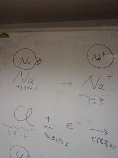 電子がくっついたり、離れたりすることがイメージ出来ていないので、絵を書いて教える(写真のように)。