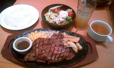 ステーキ以外は全て食べ放題(内容は、サラダバー、ライス、スープ、カレー、フルーツ)。