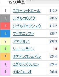 昨日(2014年4月19日)の佐賀3レースの発走約50分前の単勝オッズです。6番シェールラインの単勝に誰かが大量投票した模様。結局、最終的にも6号馬の単勝は1.0倍(2番人気の4号馬の単勝は8.5倍)で変わりませんでした。レースは最後の直線で6号馬が4号馬を差し切って4馬身差で勝ちました。1.0倍なので、この馬に大量投票した人は1円の得にもなりませんでした。いったいいくら投票したらこんなオッズになるんでしょう??