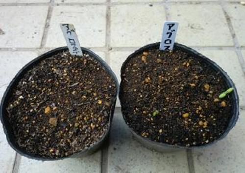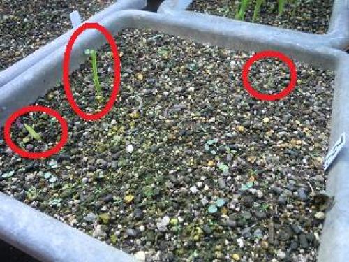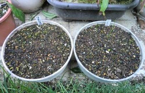 今日は気温10~20℃、晴れである。明日は気温12~19℃、晴れの予報である。9月20日にポットに種蒔きをしたアグロステンマが発芽を始めた。(アグロステンマの種蒔きポット。各ポットに15粒ずつ計30粒蒔いたうち右のポットで発芽してきた。)(右のポット。15粒のうち3本発芽。)早ければ1週間ほどで発芽するはずであったのに、全く発芽しなかったが、過去の経験では10月下旬になってからひょっこり発芽してくるものもあったので、様子を見ていたものである。(なお、バックアップとして10月5日に濡れティッシュの上に蒔いて発根した種2粒を8日にミニポットに植えたものは1本が発芽しており、)(ポットに植え替えた。)(また、濡れティッシュの上の種がまた1粒発根したので、)(ミニポットに植えた。)・・・・・・オキザリス・バーシーカラーが発芽した。(オキザリス・バーシーカラー。)昨年の発芽10月18日とほぼ同じである。バーシーカラーの咲き始めは08~11年は11月初旬~12月中旬であったが、昨シーズンは年明けの今年の1月10日と大幅に遅くなった。南側に家が建ち、日当たりが悪くなったためかも知れないが、もしそうだとすると今シーズンの咲き始めも1月になるかも知れない。・・・・・(ベゴニアを4株定植。プランター植えは累計62株。)