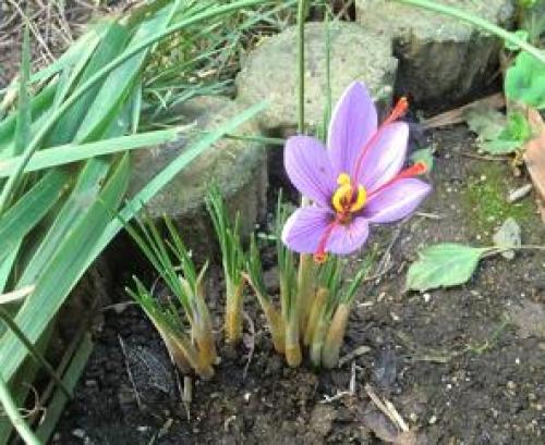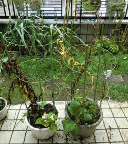 今日は気温22~28℃、晴れであるが、台風の影響で強い風が吹きまくっている。明日は気温20~24℃、晴れの予報である。サフランが発芽した。(発芽したサフラン。)(黄〇は水仙の球根。水仙もサフランもここに植えた記憶がなく何年か前から自然に?生えてきたものである。・・・球根の混ざった古土をここに捨てたのかも知れない。ちなみに、すぐ近くに植えた覚えのないチューリップも生えてくる。)(この場所は通り道になってるので、保護としてリング状支柱を設置。)昨年はこの場所のサフランの発芽を見つけたのは10月24日なので、今年は半月ほど早い。昨年の咲き始めは11月9日であったが、今年は10月中に開花するかも知れない。(また別の場所のはまだ発芽していない。この場所は塗装工事の足場の下になっており、消えたかも知れない。緑の葉はこぼれ種のフユシラズである。)(8月3日に鉢に植えたサフランもまだ発芽していない。昨年の発芽は10月6日だったので、こちらは今年は遅れた。)・・・・・(秋咲きクロッカスは10月3日に2本発芽したが、その後はほとんど変化がない。)(八重コルチカムの2輪目(左上)が開花した。1輪目(右下)は強風で傾いている。)(こぼれ種ビオラ。)