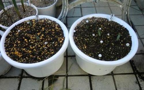 今日は気温6~12℃、晴れのち曇り一時雨である。明日は気温4~10℃、晴れの予報である。以前の週間予報では明日の最低気温は氷点下近くになりそうなはずだったが、そうでもなくなった。その代わり13日(金)の最低気温が-2℃(at水戸)、14日(土)が-3℃(at水戸)となっているので当地でもいよいよ氷点下に突入かも知れない。ちなみに、昨年の最初の氷点下は12月10日であった。(当日の最低気温は記録上は1℃であったが、プランターの土が凍って盛り上がっていた。)アグロステンマの定植をした。(定植したアグロステンマ6株。)9月20日にポットに30粒種蒔きしたものと10月5日に濡れティッシュに30粒種蒔きしたもので、全部で11株育っており、今日はそのうちの6株を定植した。(定植待ちの残り5株。これらは地植えにするつもりである。)今年は発芽するのにだいぶ時間がかかったので、定植は例年より1ヶ月ほど遅いが、開花は例年並みの5月と予想している。(今年5月のアグロステンマ。)・・・・・・・(冬咲きチャレンジチューリップ6球のうち4球目(赤〇)が発芽した。黄〇は先に発芽した3球。)(オキザリス・バーシーカラーの蕾が育って花びらが見えてきた。)(11月17日から吊している干し柿。1個味見したところもう完成状態である。)