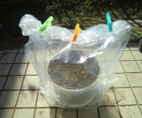 今日は気温3~11℃、晴れのち曇りである。明日は気温4~11℃、晴れの予報である。次第に気温が下がってきているので、冬咲きチャレンジチューリップの鉢のために簡単な温室を作ることにした。(ビニール袋を二重にして、中に鉢の水受け皿を置いて、)(チューリップの鉢を収容。ビニールは生協宅配の商品が入っていた袋の再利用である。)(なお、鉢にはビニールがベタッとならないようにリング状の支柱を建ててある。)(チューリップは現在6球中4球(赤〇)が発芽。黄〇が残り2球の発芽予定地。)(発芽予定地の土が盛り上がってきているようなので、5球目もそろそろ発芽しそうだ。)(それはさておき、袋の口を洗濯バサミでクリップ。水やりが面倒だが、しばらくは口を開いて発芽状態をチェックすることになるので、その時に必要であれば水やりをすればよい。)(反対側から見た状態。)(今日から日中は屋外で、夜は室内に入れることにする。)・・・・・・(種蒔きビオラ1号が開花した。)(夏越しポリアンサの黄色が久しぶりに開花しそうだ。)(ムクゲを、)(剪定した。)(切り戻したサルビアの親株など11株とこぼれ種ベゴニア5株を室内に収容。これでもうサルビア・ベゴニア用のスペースは無い。)