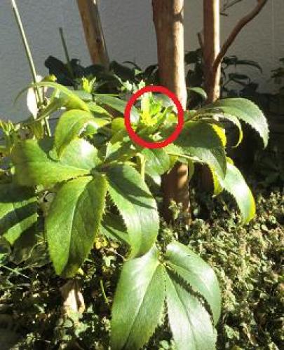 今日は気温2~13℃、晴れである。明日は気温2~9℃、晴れの予報である。木立性クリスマスローズ・コルシカスに蕾が見えてきた。(クリスマスローズ・コルシカス。赤〇部に蕾が見えた。)例年は蕾が見えてくるのは12月下旬であり、今までの最早が10年の12月22日だったので、今年は10日ほど記録を更新した。その最早だった10年の咲き始めは12月30日だったので、今年の咲き始めは12月20日ごろと予想される。なお、昨年は蕾が見えたのは1月19日で開花が2月22日とかなり遅かった。・・・・・(オキザリス・バーシーカラーは今日には開花の予想をしていたが、気温が低すぎるのか?閉じたままである。)(マラコイデスの花茎が伸びてきた。)(ビオラを2株買ってきた。)(冬咲きチャレンジチューリップの簡易温室のビニールを透明ポリ袋に変更した。前のビニールは生協宅配商品用袋の再利用だったが、新しいのはホームセンターから買ってきた袋である。今回も二重にしている。)(そのチューリップの5球目と6球目も発芽した。)(プリムラ・オブコニカを室内に入れた。)(マラコイデスを10株定植。累計513株。)