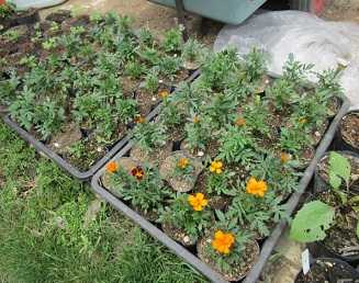 今日は気温15~19℃、曇りのち晴れである。明日は気温14~17℃、曇りの予報である。マリーゴールドが開花を始めたので定植を開始した。(マリーゴールド。既に10株ほど開花している。)(とりあえず4株を円形プランターに定植。)(色はオレンジ、赤茶、黄色などのミックスであるがオレンジが優勢なので今日は4株ともオレンジとした。)マリーゴールドは全部で55株あり、今後開花するにしたがって順次定植する予定である。・・・・・・・(西洋翁草の髭。)(オキザリス・レグネリー。)(イキシア。)(ブラキカム。)(フロックス・カロリナ。)(ダリアは10ポットのうち5ポットが発芽してそのうち3ポットは定植しており、発芽してない5ポットはしばらく様子を見ていたものの、そろそろ処分しようとしたところ、新たに1ポットが発芽していた(赤〇)。黄〇は既に発芽していたもの。)ということで、もうしばらく様子を見ることにした。(先日8号鉢に3ポット定植したダリア。)