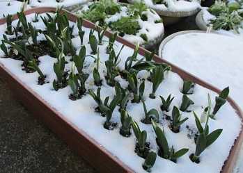 今日は気温-4℃~1℃、曇り一時雪のち晴れである。昨日の予報では雪はあまり降らなさそうであったが、そんなことは無く夜になってしっかり降って、日付が替わる前に3~4cm積った。今までも雪はチラホラと舞ったことはあるが、積もったのは初めてであり、初積雪である。(昨夜10時頃のミニチューリップなどのプランター。)(スノードロップやマラコイデスのプランター。)(今朝のミニチューリップなどのプランター。)(マラコイデスのプランター。)(スノードロップのプランター。)(午後のヒメリュウキンカ。気温が上がらないので雪は溶けずに、)(咲いていた花が雪に埋もれている。)(黄水仙は蕾が倒されてしまった。)(外にある猫の水飲み用の容器の氷は午後になっても取り出せなかった。)(クリスマスローズ・コルシカスがグッタリしている。)雪が積もって午後になっても気温が低いままなので我が家の草花にとっては最悪のパターンとなった。また、水飲み容器の氷が午後になっても取り出せないことやクリスマスローズがグッタリしてるのは過去に記憶が無く、さらに外の水道が凍り付いていたのも多分初めての経験であり、結果としては我が家にとっても最強の寒波となったようだ。ただし、ちょっと明るい情報としては、(倒れてない黄水仙の蕾が開き始めた。)明日は気温-3~7℃、晴れのち曇りの予報である。