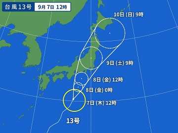 今日は気温22~25℃、雨である。(新たに開花したゼフィランサス・カリナタは倒れている。)台風13号は今夜東海地方に上陸する見込みであり、その影響で朝からずっと雨が降り続いている。(台風13号の予想進路図。Yahoo天気情報から拝借。)だが、雨は降ってはいるものの風は今のところはあまり吹いていない。予報では今日15時頃の風速の6m/sが最大であり、その後は台風が最接近する明日午前中の風速は最大でも4m/sであるので、今回の台風による草花への被害の心配はあまり無さそうだ。明日は気温26~31℃、雨のち曇り時々晴れの予報である。週間予報を見ると9月15日(金)までの最高気温は連日30℃を越えており涼しくなるのはしばらくお預けのようだ。・・・・・・(ハイビスカスの125~126輪目の蕾。)