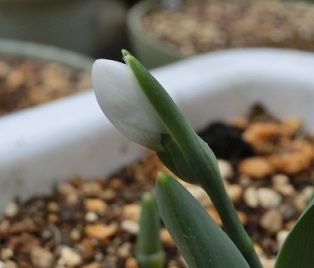 (スノードロップの蕾。昨日は1月14日前後に開花と予想したばかりであるが、ちょっと早まるか?)