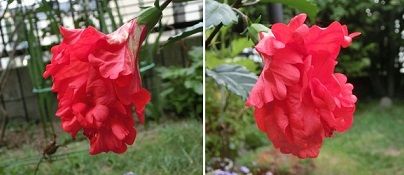 (ハイビスカス。今日は2輪開く予定(赤〇)。黄〇は昨日の花。)