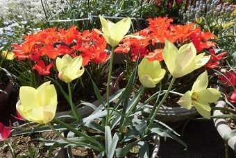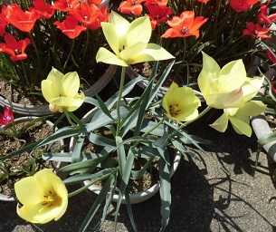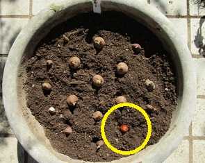 (発芽したホンキートンク(赤〇)。円形プランターに17球植えてある。黄○にも発芽してるものがあるが、ホンキートンクでは無さそうだ。)