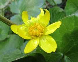 (ヒメリュウキンカ。こぼれ種で別の場所に咲いたものにだいぶ遅れたが、群生のものも咲いた。)