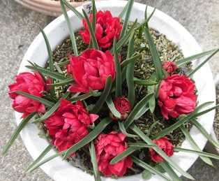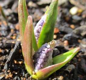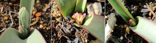 (先に出てきたミニチューリップの蕾。左からミニチューリップ・ポリケロマ、アルバ、ヒルデ。)